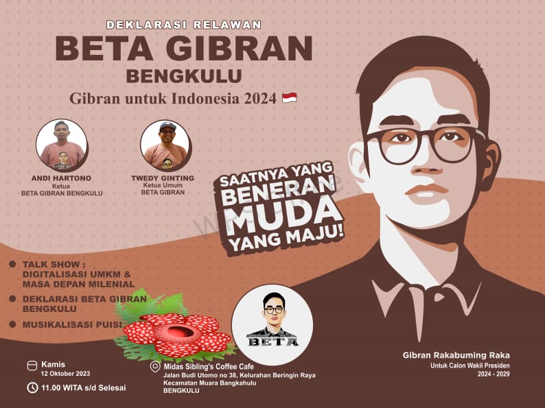Infonegeri, BENGKULU – Relawan Beta Gibran Bengkulu gelar deklarasi calon wakil presiden (Cawapres) berpasangan dengan Calon Presiden (Capres) Prabowo Subianto pada Pemilihan Umum (Pemilu) 2024, di Midas Sibling’s Cafe, Kamis (12/10/2023). Deklarasi yang berlangsung merupakan ikhtiar untuk mewujudkan kebahagiaan bagi setiap anak bangsa tanpa terkecuali. Kebahagian dalam pangkuan ibu pertiwi, Indonesia Tercinta. Berangkat dari itulah […]